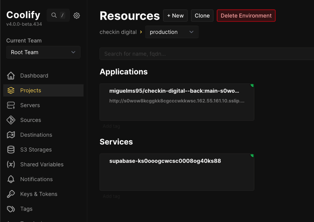 Ejemplo de coolify para uno de mis side-projects: Checkin Digital, un sistema de fichaje de clases basado en geolocalización.